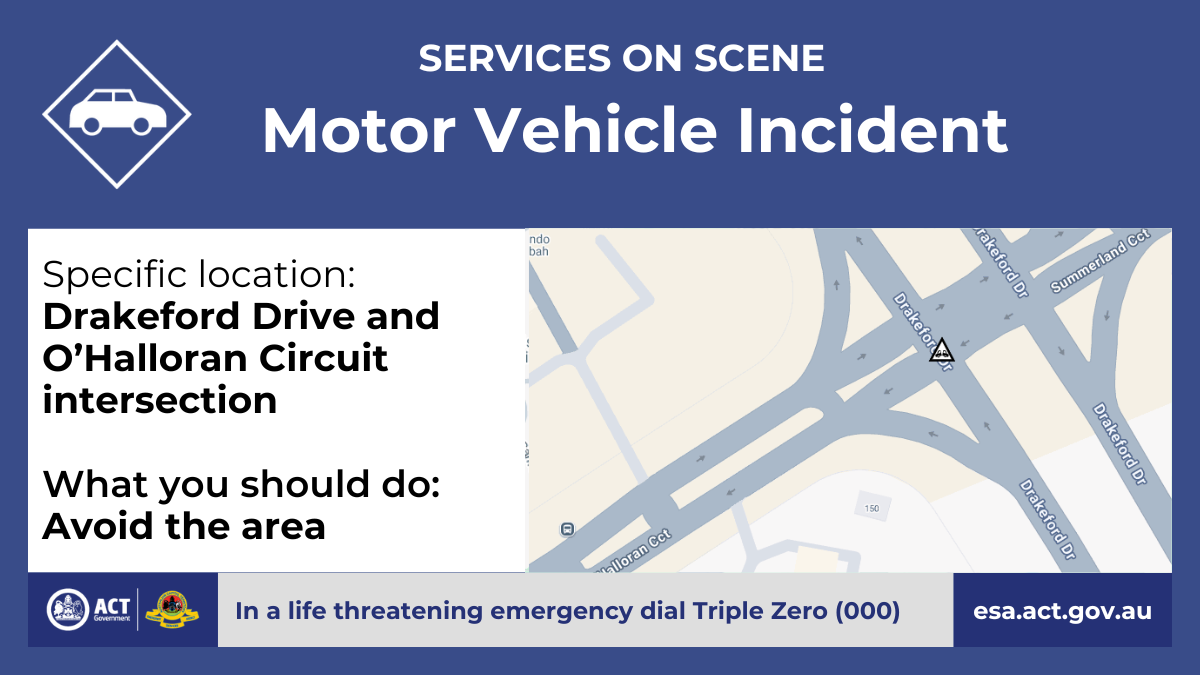 A motor vehicle incident has occurred at the intersection of Drakeford Drive and O’Halloran Circuit. The northbound lanes of Drakeford Drive are closed at the incident.