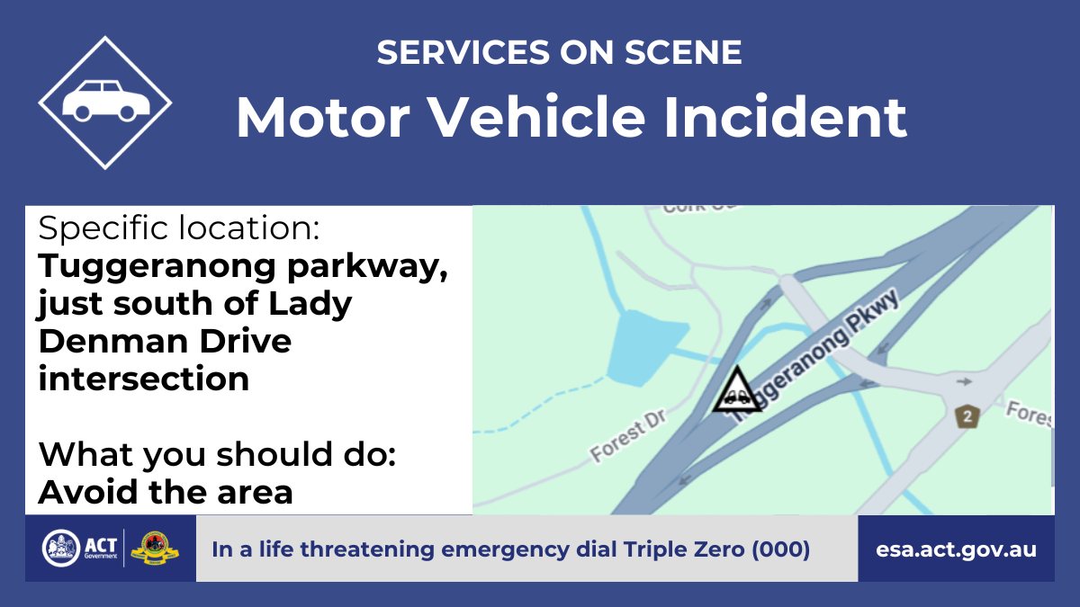 A motor vehicle incident has occurred on the Tuggeranong parkway, just south of the intersection with Lady Denman Drive.