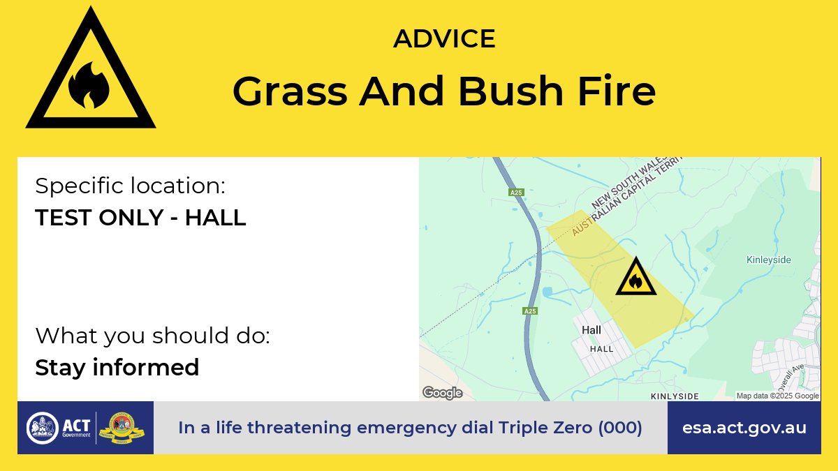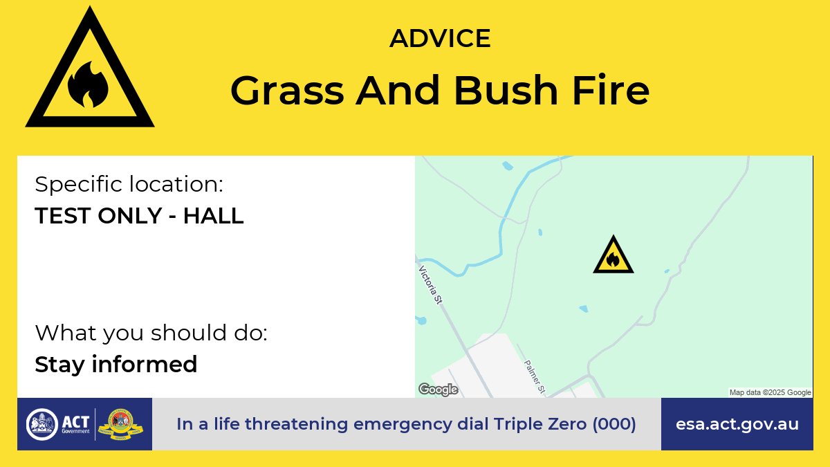 TEST, TEST - This is a test of the ACT’s warning publishing system. No action or response is required from the public. You will see further tests like this during the next hour. For further information go to www.esa.act.gov.au or telephone Access Canberra on 13 22 81.