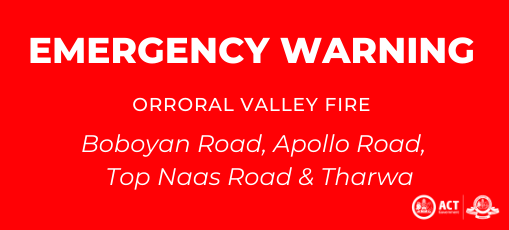 The ACT Emergency Services Agency (ESA) advises that people in the remote areas of Orroral Valley and surrounding areas could be affected by a bushfire near Boboyan Road, Apollo Road, Top Naas Road, conditions are changing and could get worse. You need to be ready to follow your Bushfire Survival Plan.