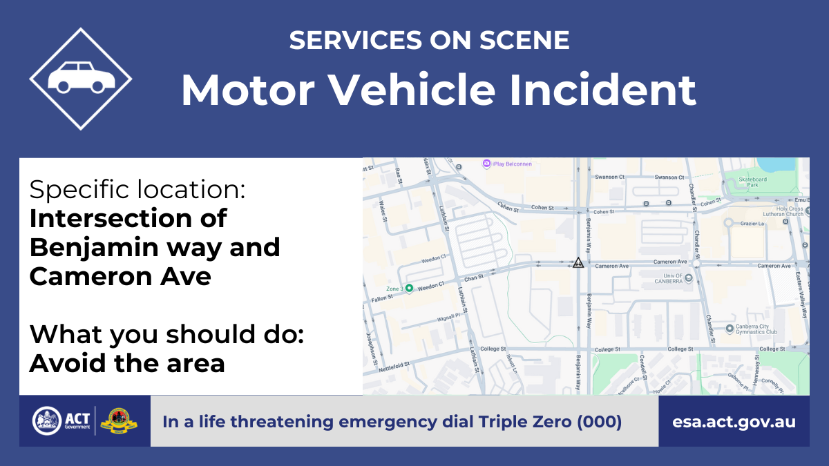 A motor vehicle incident has occurred at the intersection of Benjamin Way and Cameron Avenue. Benjamin Way is closed in both directions.