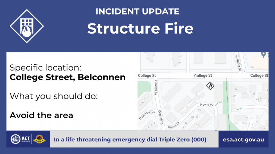ACT Fire & Rescue (ACTF&R) are on scene at a structure fire on College Street, Belconnen. Firefighters have extinguished the fire and the building has been evacuated.