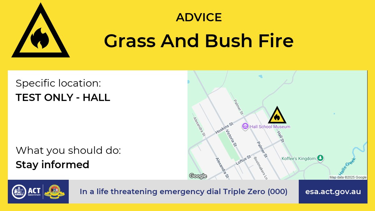 TEST, TEST - This is a test of the ACT’s warning publishing system. No action or response is required from the public. You will see further tests like this during the next hour. For further information go to www.esa.act.gov.au or telephone Access Canberra on 13 22 81.