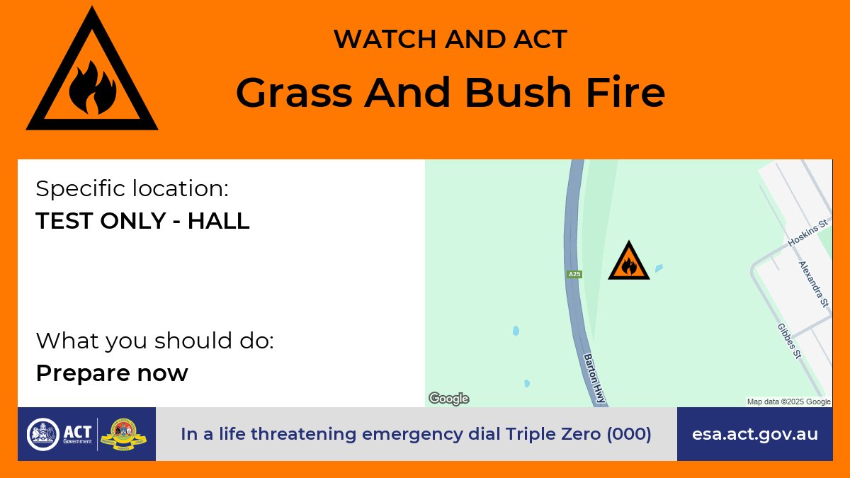 TEST, TEST - This is a test of the ACT’s warning system. No action or response is required from the public. You will see further tests like this during the next hour. For further information go to www.esa.act.gov.au or telephone Access Canberra on 13 22 81.