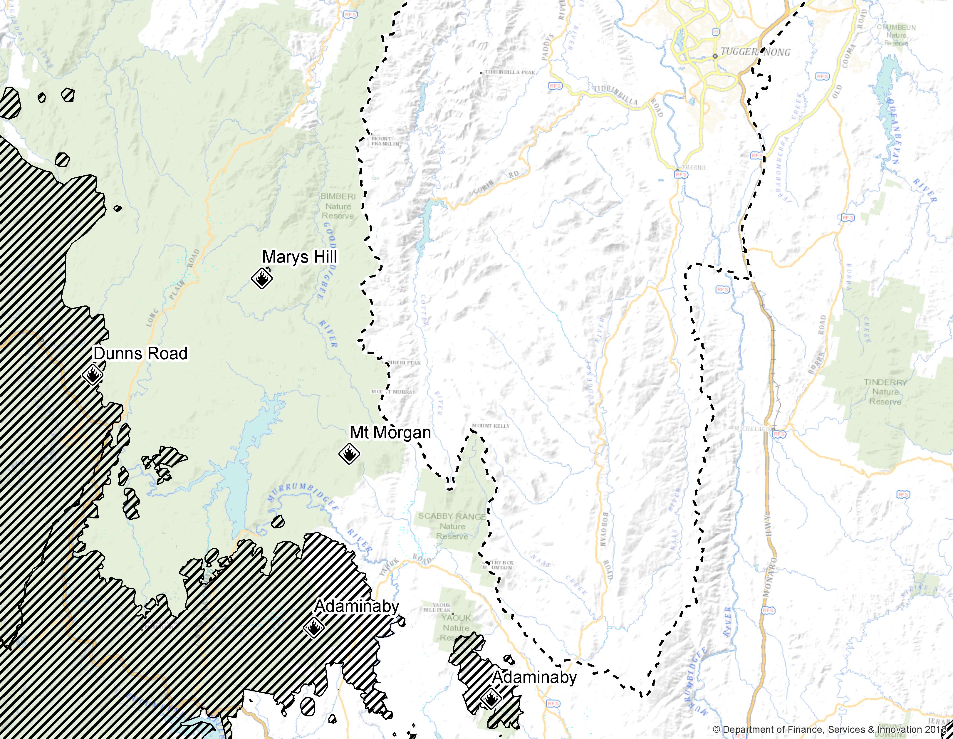 The Dunn’s Road Fire is 20 km west of the ACT border and 46.7 km from the urban interface.
